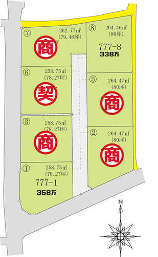 | 備考 | 地目変更引渡(田→宅地)上下水道引込配管はありますが、水道加入金及び受益者負担金は買主様負担となります。・私道負担:あり238.47平米(共有持分:1/7)・仲介手数料:不要 / 条件等:更地渡し | ||||