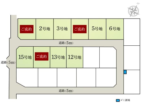 | 建ぺい率・容積率 | 60%・150% | 私道負担・道路 | 道路幅:5m、アスファルト舗装、(12号地)~(6号地) 全て私道負担なし | ||