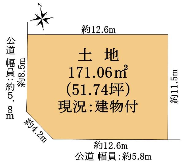 | 建ぺい率・容積率 | 70%・100% | 私道負担・道路 | 無、南5.8m幅(接道幅12.6m)、西5.8m幅(接道幅8.5m) | ||