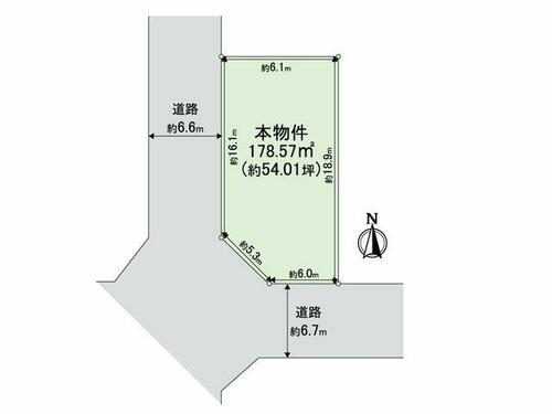 | 接道状況 | 西 6.6m 公道 接面16.1m南 6.7m 公道 接面6.0m | ||||