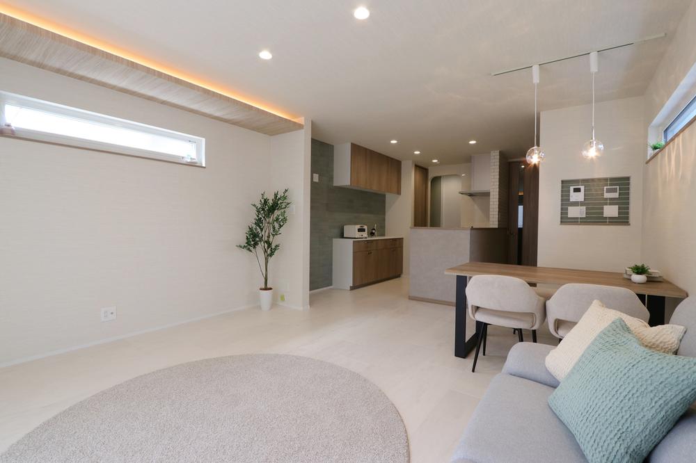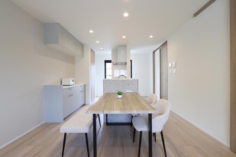 弊社施工例木目を基調にしたナチュラルテイストのLDKは、明るく開放感のある空間に。間接照明やダウンライトが、昼も夜も心地よい雰囲気を演出します。キッチンは使いやすい動線設計で、収納も豊富。