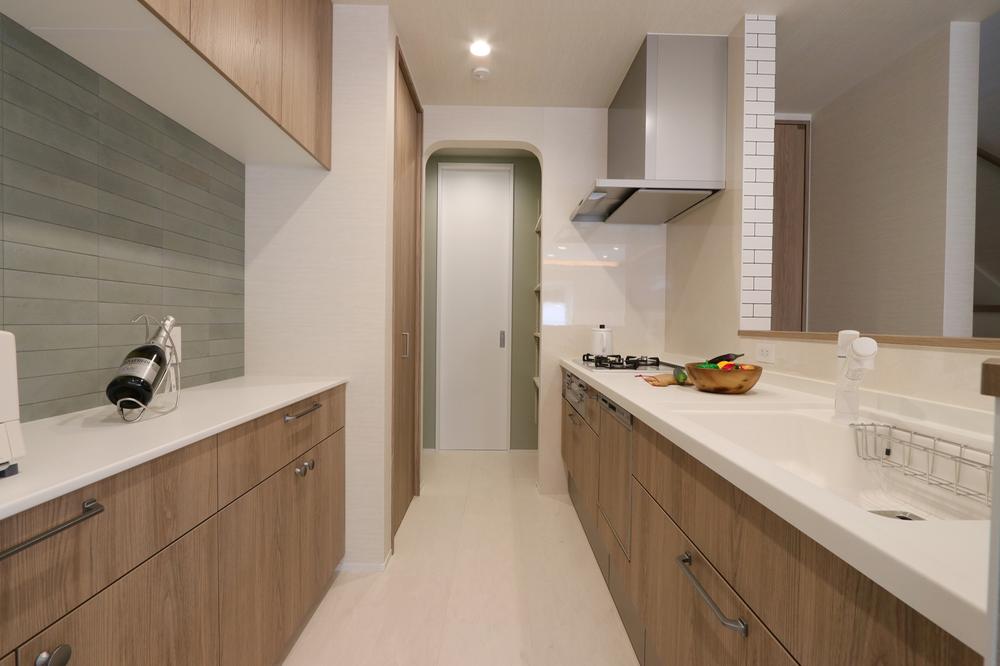 弊社施工例ナチュラルな木目とモダンなタイルが調和したキッチン。リビング・ダイニングを見渡せる開放感で、家族との時間がもっと心地よく。