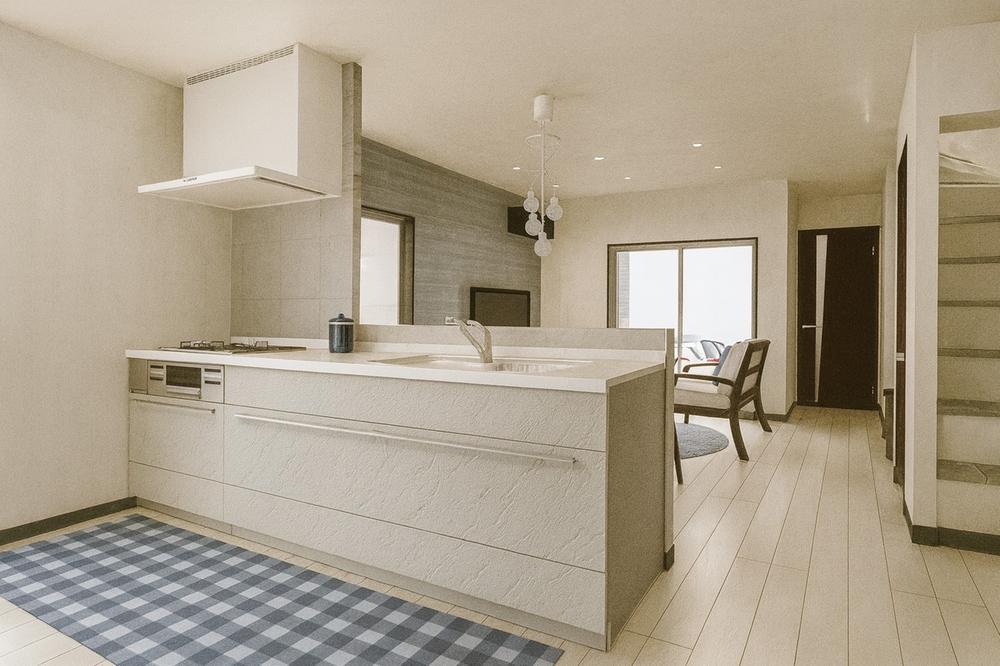 ■17.1帖LDK/イメージパースリビングが見渡せるカウンターキッチンです!家事をしながらご家族と一日の出来事を話したり!【新築参考プラン】建物価格1699万円、建物面積74.70㎡