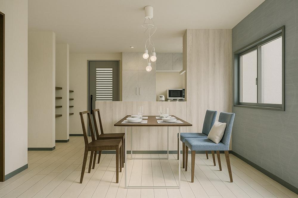 ■17.1帖LDK/イメージパース忙しい朝もしっかり家族が揃って食事をして頂けるゆとりある大きさのダイニングスペース。【新築参考プラン】建物価格1699万円、建物面積74.70㎡