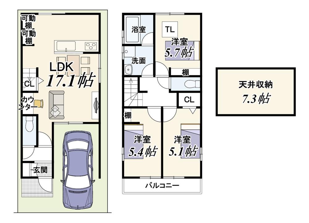 ■17.1帖LDK/イメージパース自由設計の為、お客様のご要望に合わせて間取りの変更可能!一緒に理想のマイホームを完成させましょう♪【新築参考プラン】建物価格1699万円、建物面積74.70㎡