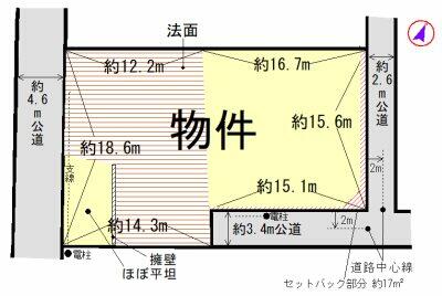 | 接道状況 | 南 3.4m 公道 接面15.1m東 2.6m 公道 接面15.6m西 4.6m 公道 接面18.6m | ||||
