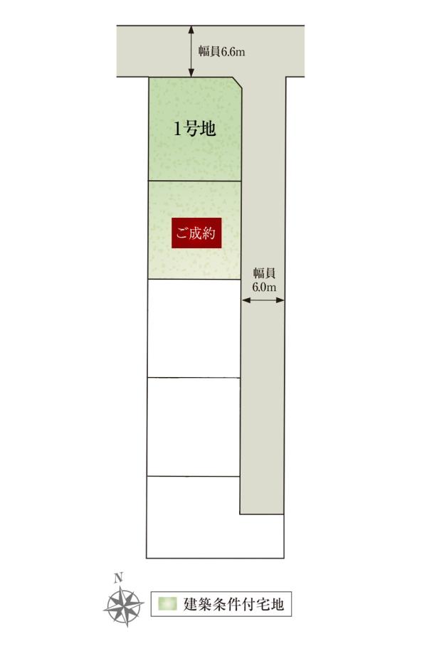 | 建ぺい率・容積率 | 60%・200% | 私道負担・道路 | 道路幅:6m~6.6m、アスファルト舗装、(1号地) 私道負担なし | ||