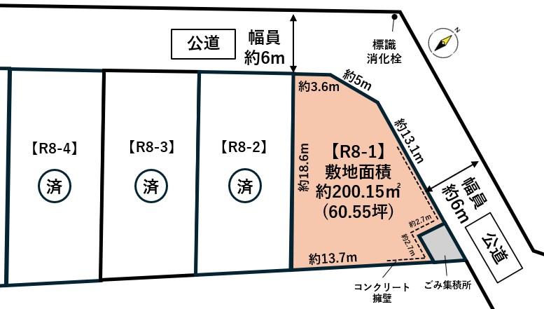 建ぺい率・容積率 | 60%・200% | 私道負担・道路 | 無、北6m幅(接道幅3.6m)、北東6m幅(接道幅13.1m) | ||