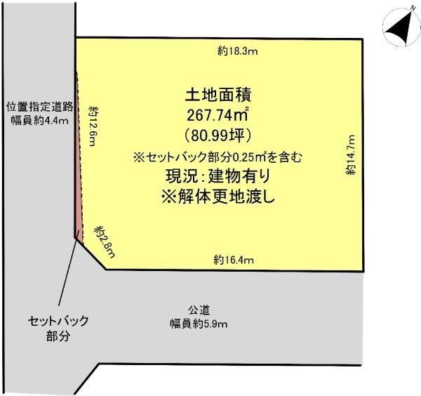 | 建ぺい率・容積率 | 50%・80% | 私道負担・道路 | 無、南東5.9m幅(接道幅16.4m)、南西4.4m幅(接道幅12.6m) | ||