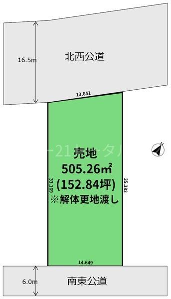 | 建ぺい率・容積率 | 70%・200% | 私道負担・道路 | 無、北西16.5m幅(接道幅13.6m)、南東6m幅(接道幅14.6m) | ||