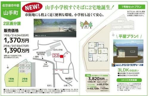 | 備考 | 面積については造成後、分筆するため確定面積ではありません。・山手小学校すぐ側に2宅地造成中!1号地1,370万円、2号地1390万円。1号地においては建築条件なし!当社で建築されるお客様に太陽光発電システム5KWをサービス致します。 | ||||