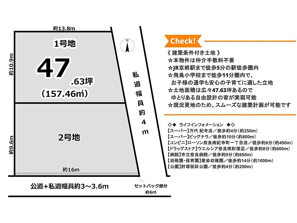 | 物件名 | 建築条件付き土地 紀寺町2区画1号地 京終駅エリア | ||||