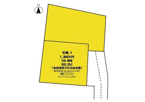 | 備考 | 面積には専用通路を含みます。建築条件付土地です。建築条件を外す場合坪3万円(有効宅地90.9坪)アップで可。・セットバック:有2.25平米 / 条件等:更地渡し | ||||