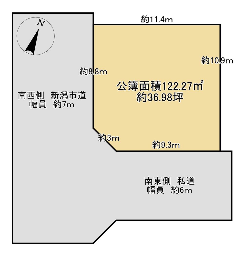 | 建ぺい率・容積率 | 60%・100% | 私道負担・道路 | 36㎡、南6m幅(接道幅9.3m)、南西7m幅(接道幅8.8m) | ||