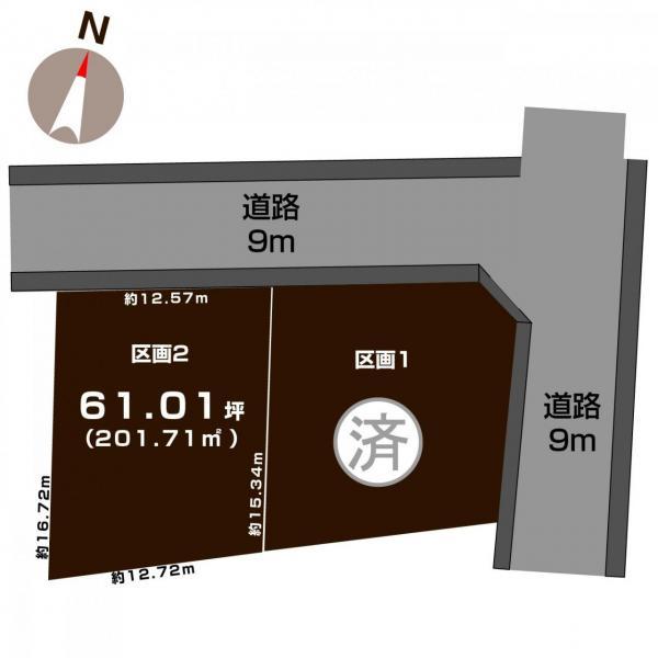 | 備考 | 担当者:髙橋 淳一、設備:LPG、・【区画1】公営水道:引込有、公共下水:引込有【区画2】公営水道:引込なし、公共下水:引込なし ・奥行と間口は地図より計測したものになりますので、実際の計測値と異なる場合がございます。 ・ライフライン引込は買主負担となります。 ・区画1:建ぺい率の角地緩和により、10%が加算されます。 | ||||