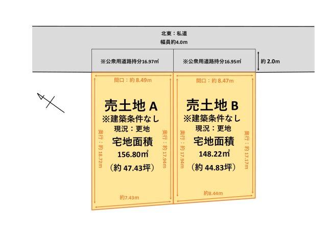 | 建ぺい率・容積率 | 60%・200% | 私道負担・道路 | 16.95㎡、北東4m幅(接道幅8.4m) | ||
