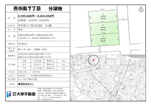 | 備考 | 総区画数:3区画販売区画数:3区画販売価格帯:839.56万円~883.40万円土地面積帯:199.8㎡(60.4坪)~208.6㎡(63.1坪)売主:有限会社大幸不動産(新潟(10)第2840号)・私道負担:なし・【建築条件無し!】ゆとりの60坪3区画!前面道路消雪パイプ完備! / 条件等:更地渡し | ||||