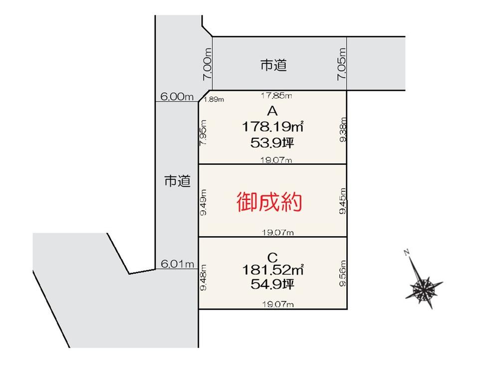 建ぺい率・容積率 | 建ペい率:60%、容積率:200% | 私道負担・道路 | 道路幅:6m~7m、アスファルト舗装、北西側:6.00m~6.01m(公道)、北東側:7.00m~7.05m(公道) | ||