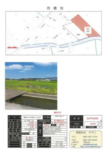 | 備考 | 農地法第3条の許可が必要。公簿取引とする。農地以外の使用目的は不可。・615.89坪農地 畑・田としてご利用いかがでしょうか 農地以外の使用目的は不可 / 条件等:現況渡し | ||||