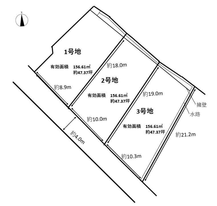 | 建ぺい率・容積率 | 建ペい率:50%、容積率:100% | 私道負担・道路 | 道路幅:4m、アスファルト舗装、1、2号地は数センチセットバック要 | ||