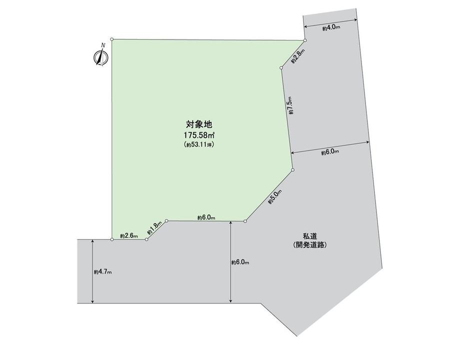 | 建ぺい率・容積率 | 60%・200% | 私道負担・道路 | 無、北東4m幅(接道幅7.5m)、南4.7m幅(接道幅6m) | ||