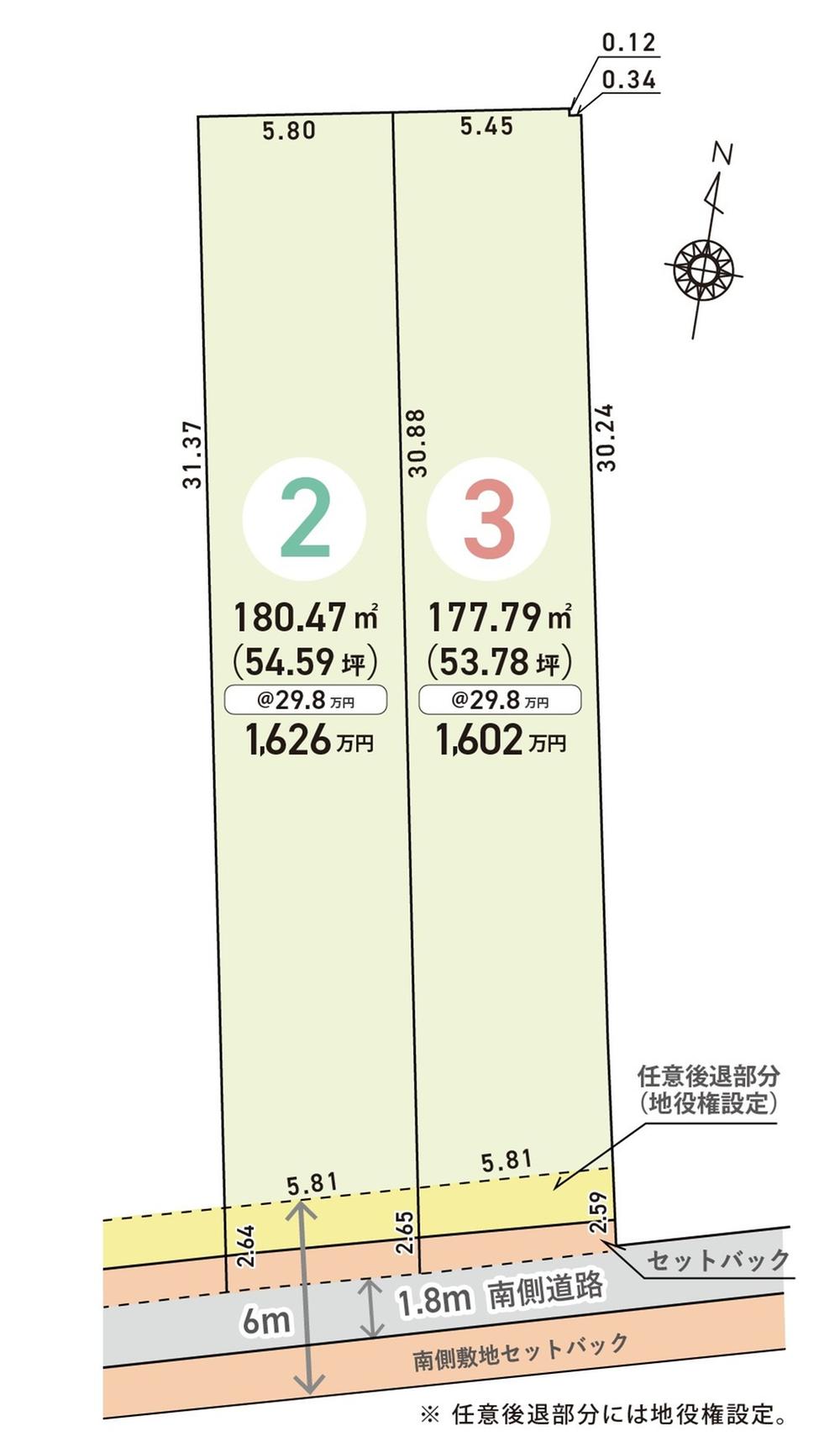| 建ぺい率・容積率 | 建ペい率:60%、容積率:160% | 私道負担・道路 | 道路幅:1.8m、アスファルト舗装、セットバック+自主後退部分あり。自主後退部分・スミ切部分には地役権設定。 | ||