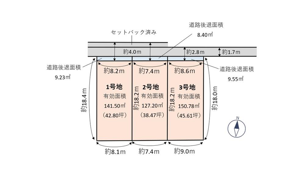 | 建ぺい率・容積率 | 建ペい率:60%、容積率:200% | 私道負担・道路 | 道路幅:1.7m、コンクリート舗装、セットバック要:約8.40㎡~約9.55㎡ 1・2号地については対面地セットバック舗装済 | ||