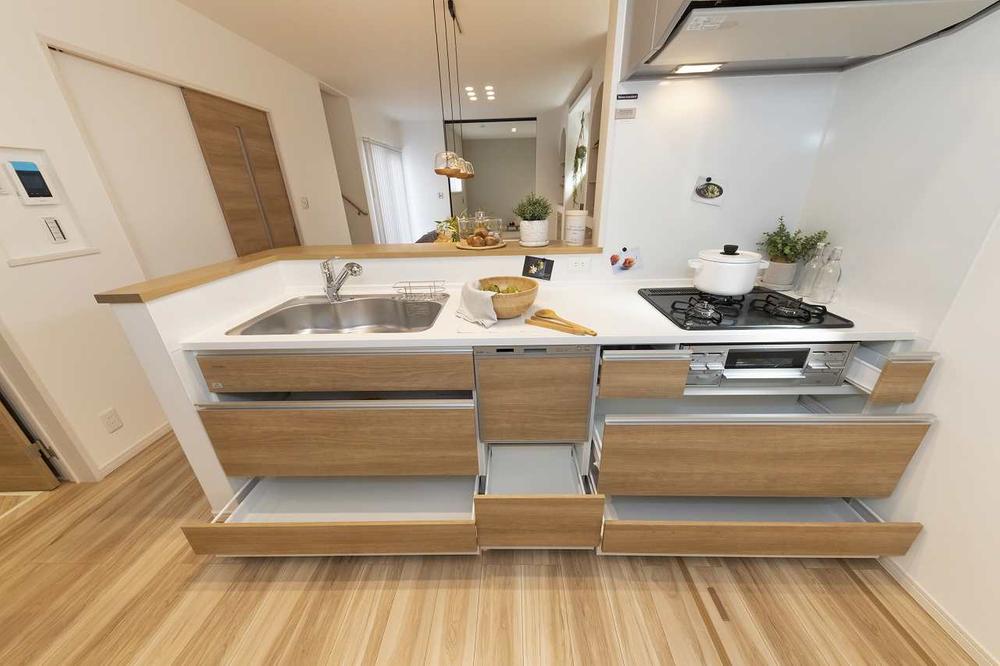 【モデルハウス・キッチン】キッチン下には調理機器や食器も仕舞える収納付き。散らかりがちなキッチンも綺麗に保てます♪