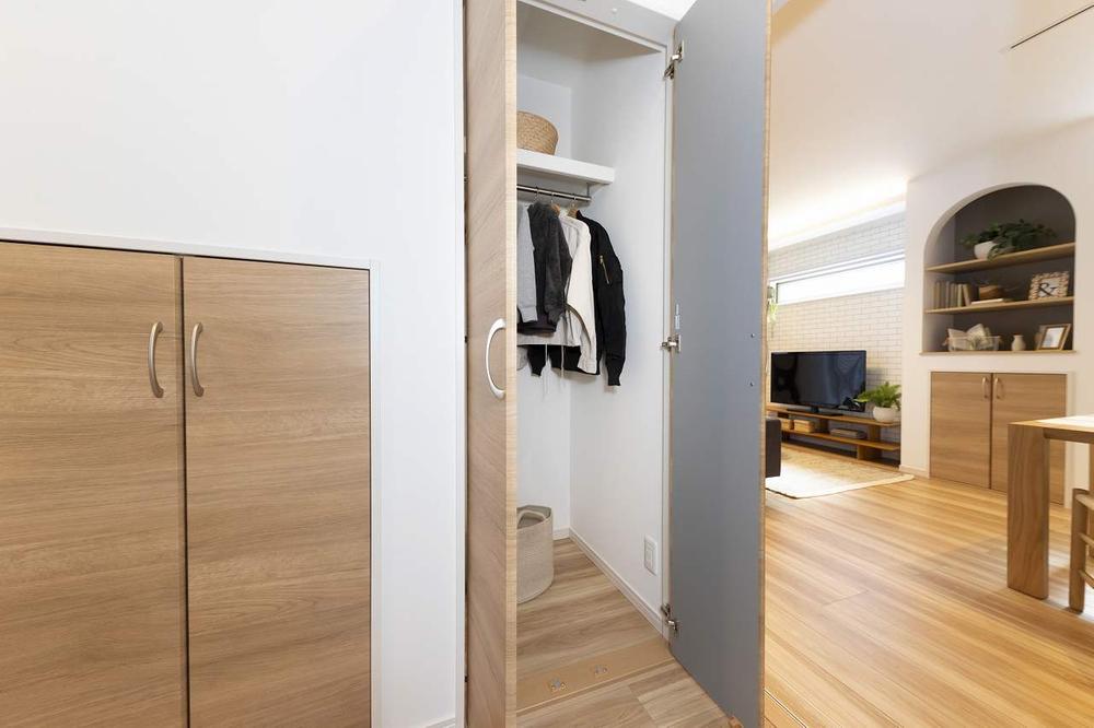 【モデルハウス・収納】玄関ホールに収納を配置。毎日着用するアウターや、お子様のスクールバッグ置場にも◎