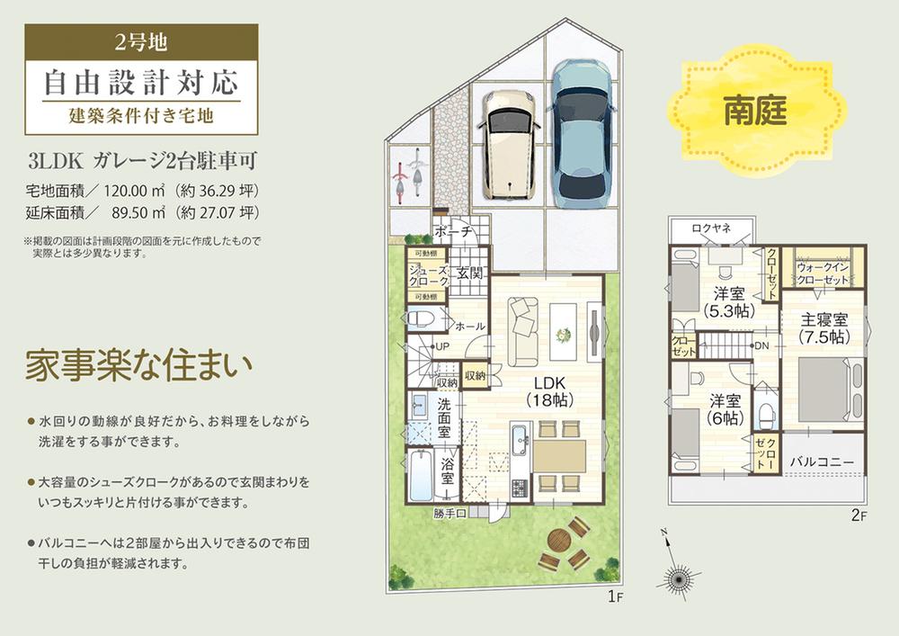 建物プラン例(2号地)3LDK、土地価格1645万円、土地面積120㎡、建物価格1935万円、建物面積89.5㎡
