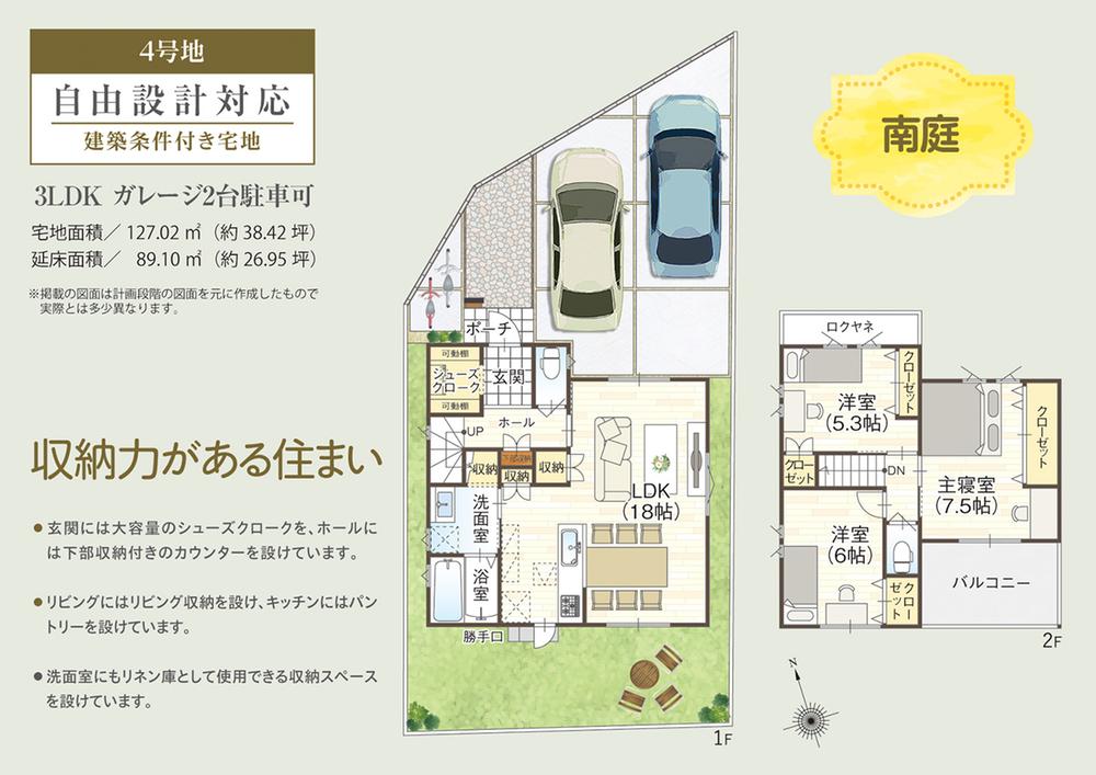建物プラン例(4号地)3LDK、土地価格1754万円、土地面積127.02㎡、建物価格1926万円、建物面積89.1㎡
