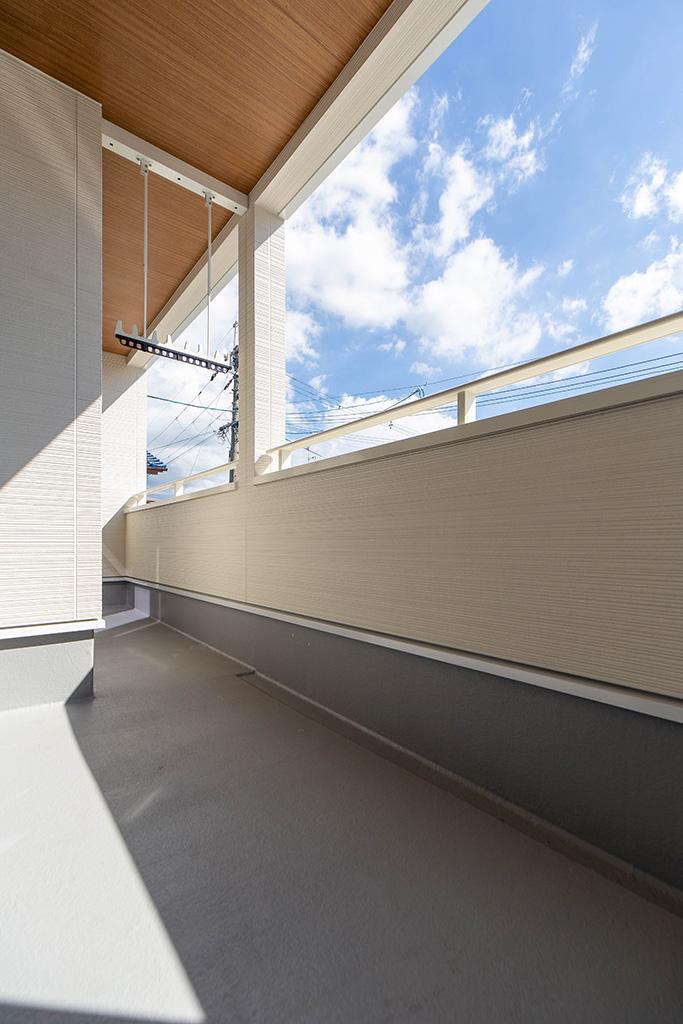 当社施工例ルーフバルコニーは天候が不安定な時の洗濯物干しに重宝するだけでなく、夏場の強い日差しを和らげてくれます。
