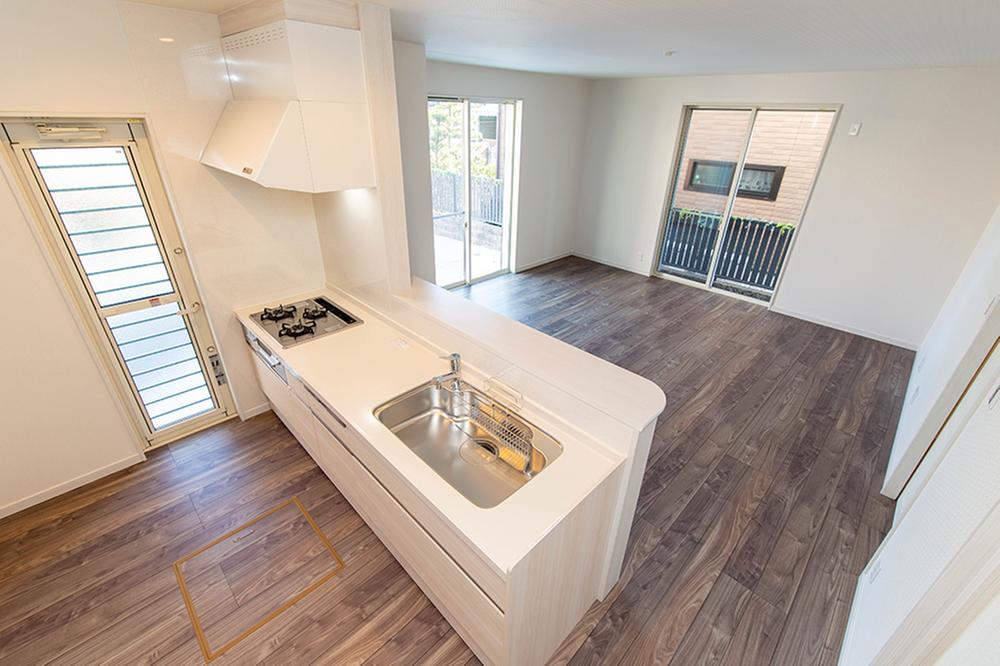 当社施工例勝手口付きの参考プランをご用意しております。オープンタイプのキッチンは団らん空間に広がりが生まれます。