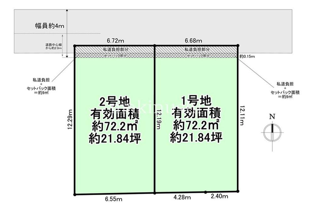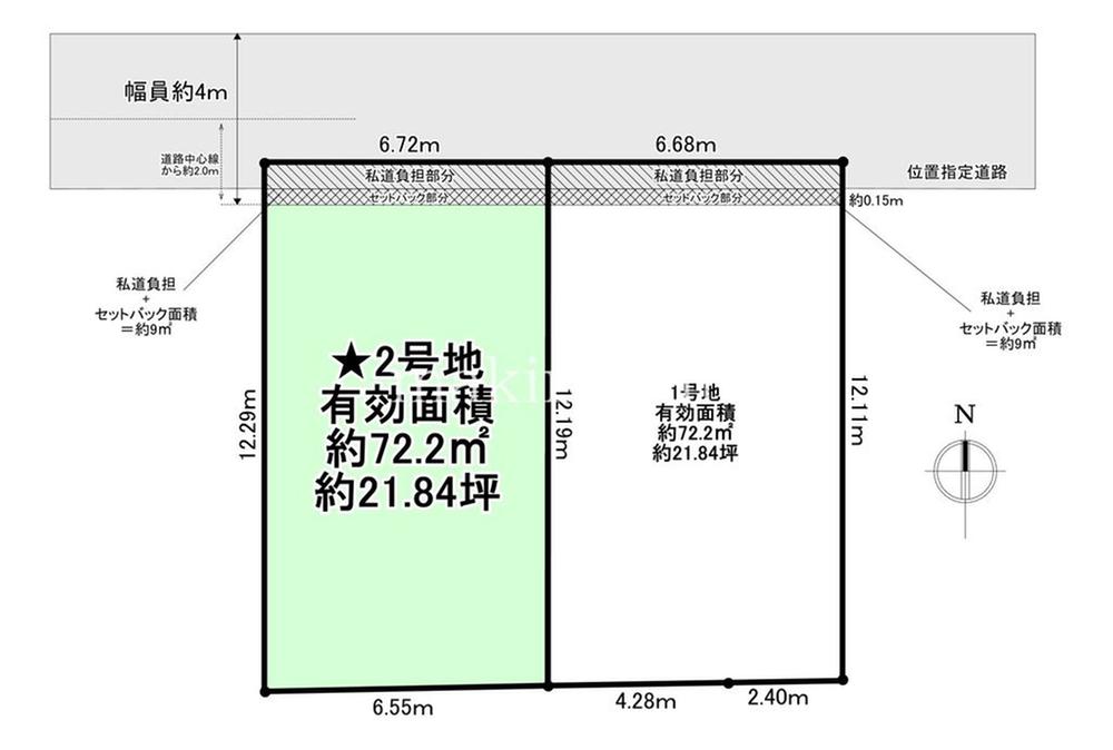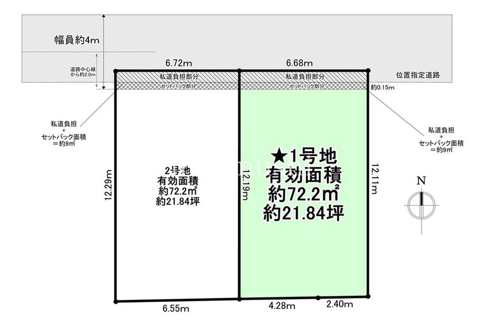 | 建ぺい率・容積率 | 建ぺい率60%・容積率160% | 私道負担・道路 | 道路幅:4m、北側 私道 位置指定道路 | ||