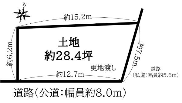 | 建ぺい率・容積率 | 60%・200% | 私道負担・道路 | 無、南8m幅(接道幅12.7m)、東5.6m幅(接道幅7.5m) | ||