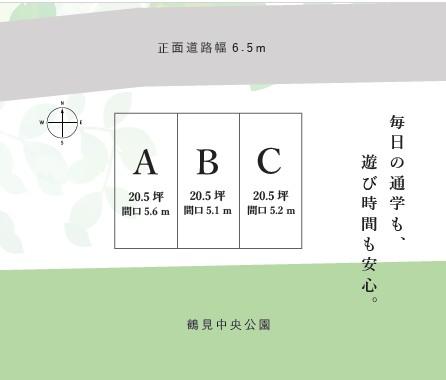 大阪市内で希少な、幅員6.5mの広々とした前面道路。 運転に不慣れな方でも落ち着いて車庫入れが可能です。 南側公園につき陽当り良好。鶴見南小徒歩3分と、住環境も整った限定3区画です。