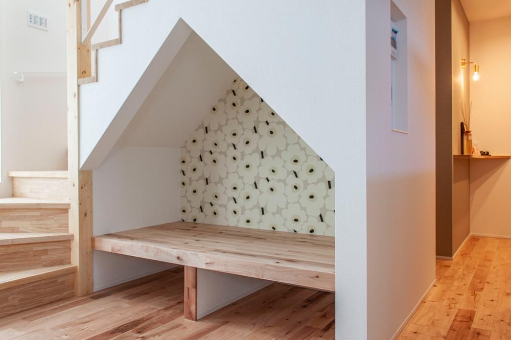 【弊社施工例】三角屋根の入り口がキュートな階段下ヌック。 ベンチに腰掛けてコーヒーを飲んだり、ペットのくつろぎスペースにしたり。 無駄なく、可愛く。 空間を遊び尽くすアイデアがここにあります。