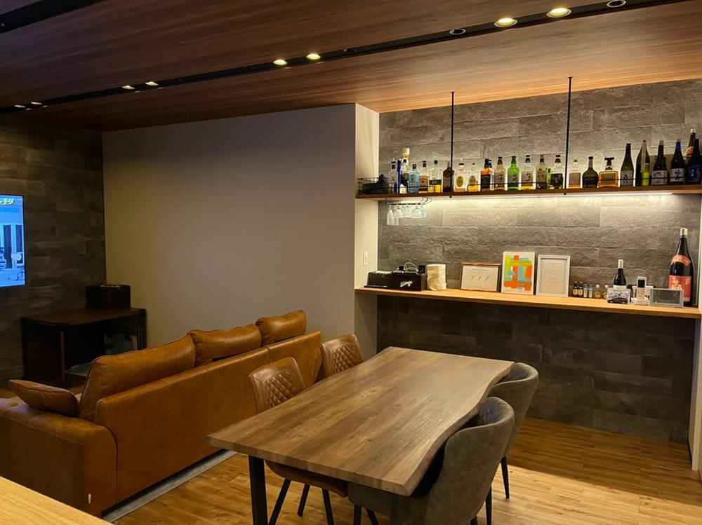 【弊社施工例】バーのようなボトルディスプレイに、グラスハンガー。 重厚な石壁を照らす間接照明。 「好き」を眺めながら、旨い酒を飲む。 そんな至福の時間を叶える、オーダーメイドの空間です。