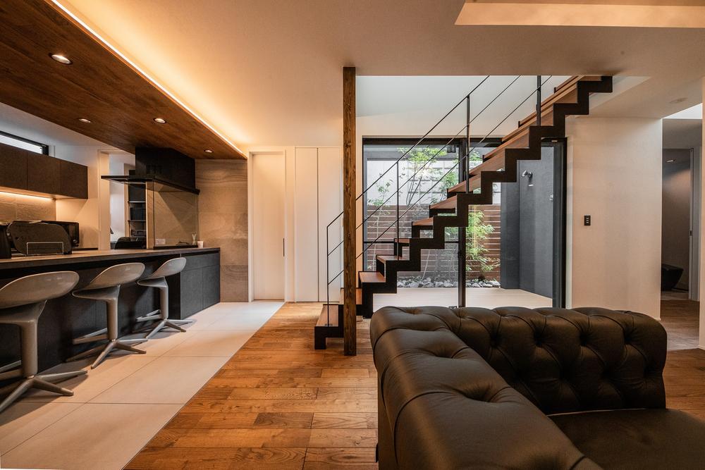 【弊社施工例】空間を分断しがちな階段を、あえて美しいオブジェのようなスケルトンデザインにすることで、視線はそのまま奥の中庭へと誘われます。そこに居るだけで心が満たされる上質な寛ぎの空間です。