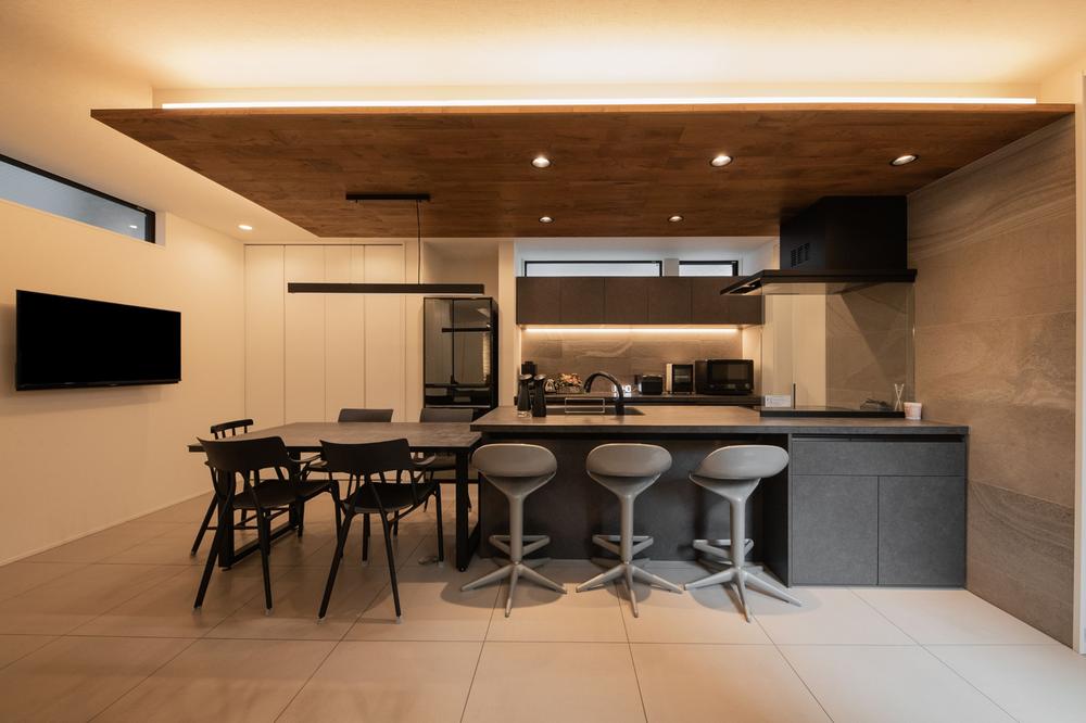 【弊社施工例】木目の下がり天井からこぼれる柔らかな間接照明が、マットグレーのキッチンをドラマチックに演出。 レストランに行くよりも、家で過ごす時間が一番贅沢。 そんな豊かな時間を叶えるLDK。