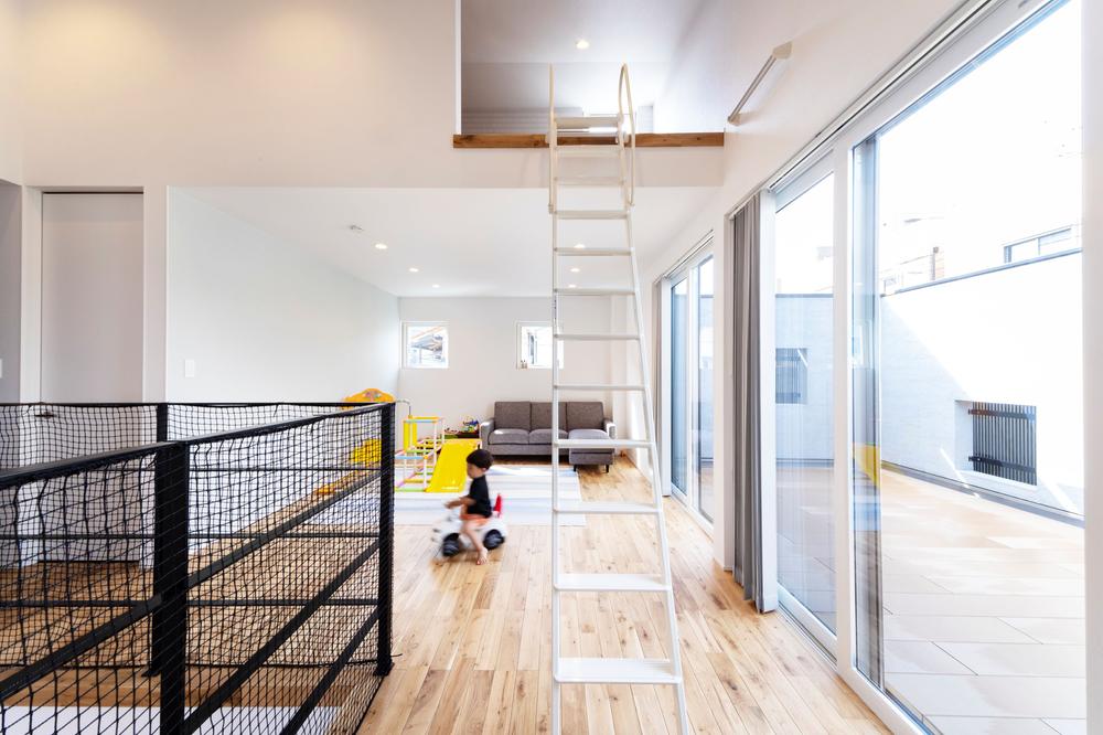 【弊社施工例】大きな掃き出し窓を開け放てば、テラスまで一続きの広大なプレイルームに。 頭上には秘密基地のようなロフト、足元には無垢床の優しさ。子供たちの笑い声が、光とともに家中に降り注ぎます。