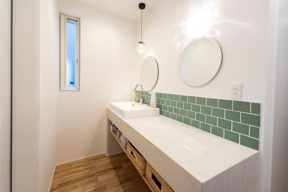 【弊社施工例】モールテックスの天板が持つクールな質感に、くすみグリーンのサブウェイタイルで優しいアクセントをプラス。 既製品の洗面台にはない、建築家住宅ならではのオリジナルデザインです。