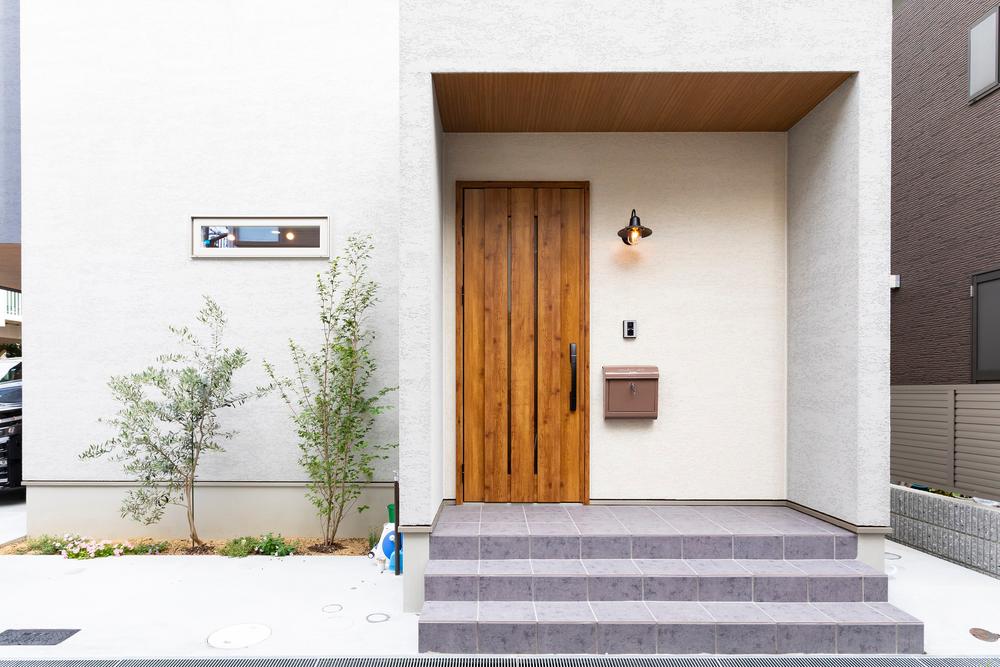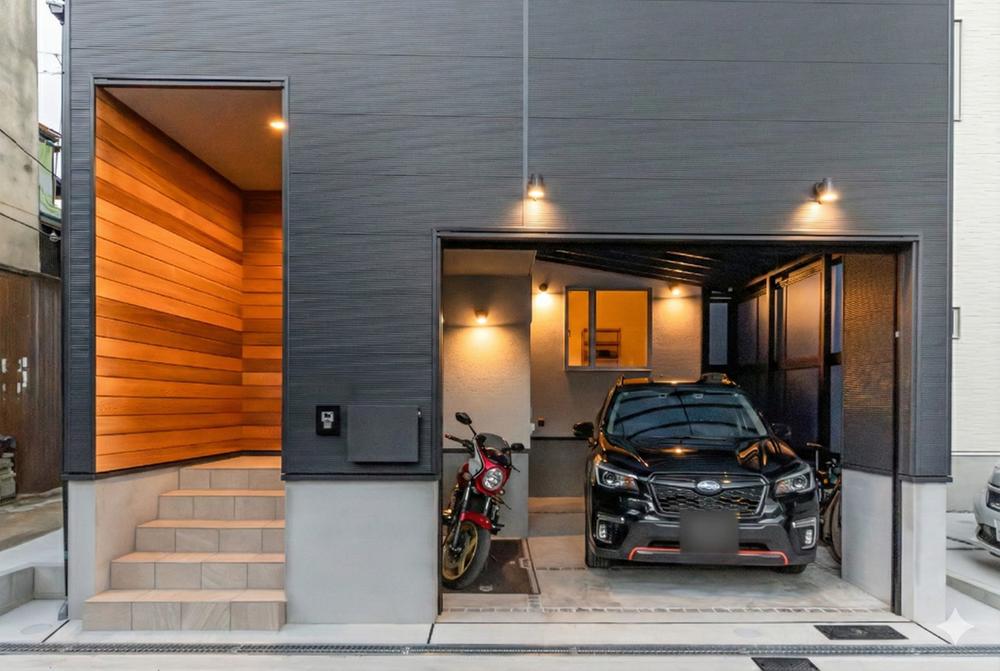 【弊社施工例】ダークカラーのガルバリウムが放つクールな存在感に、玄関アプローチの天然木が温かな表情を添えるファサード。ただの駐車スペースではなく、建物の一部として美しく統合され一際目を引く個性。