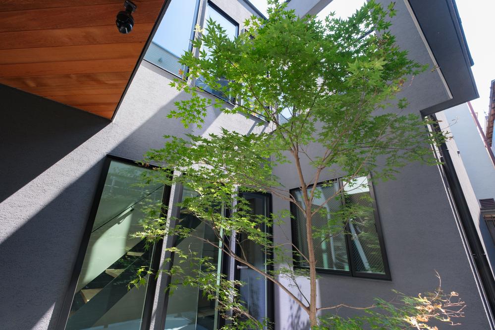 【弊社施工例】日差しの角度によって刻々と表情を変える、美しい陰影。 外壁のクールな質感と、暖かみのある木目の軒天が織りなす上質なコントラスト。 中庭のモミジは季節の移ろいを感じさせてくれます。