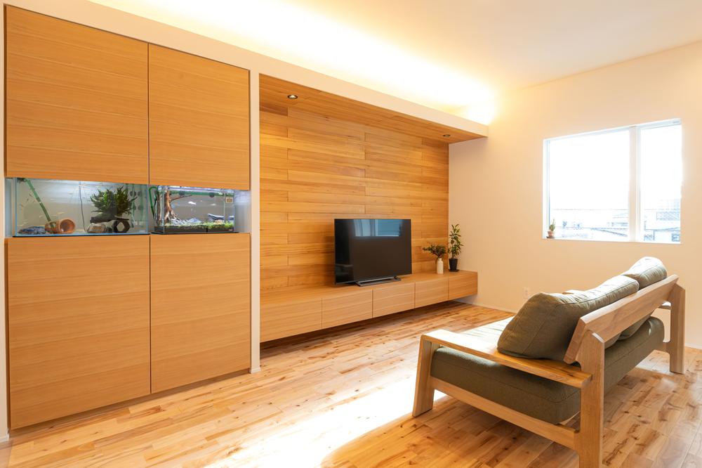 【弊社施工例】同じ木目のトーンで統一されたシームレスな空間デザイン。 壁面収納に水槽をビルトインし、配線や器具を隠してスッキリと。 木の温もりと水の清涼感が調和する、オンリーワンのインテリア。