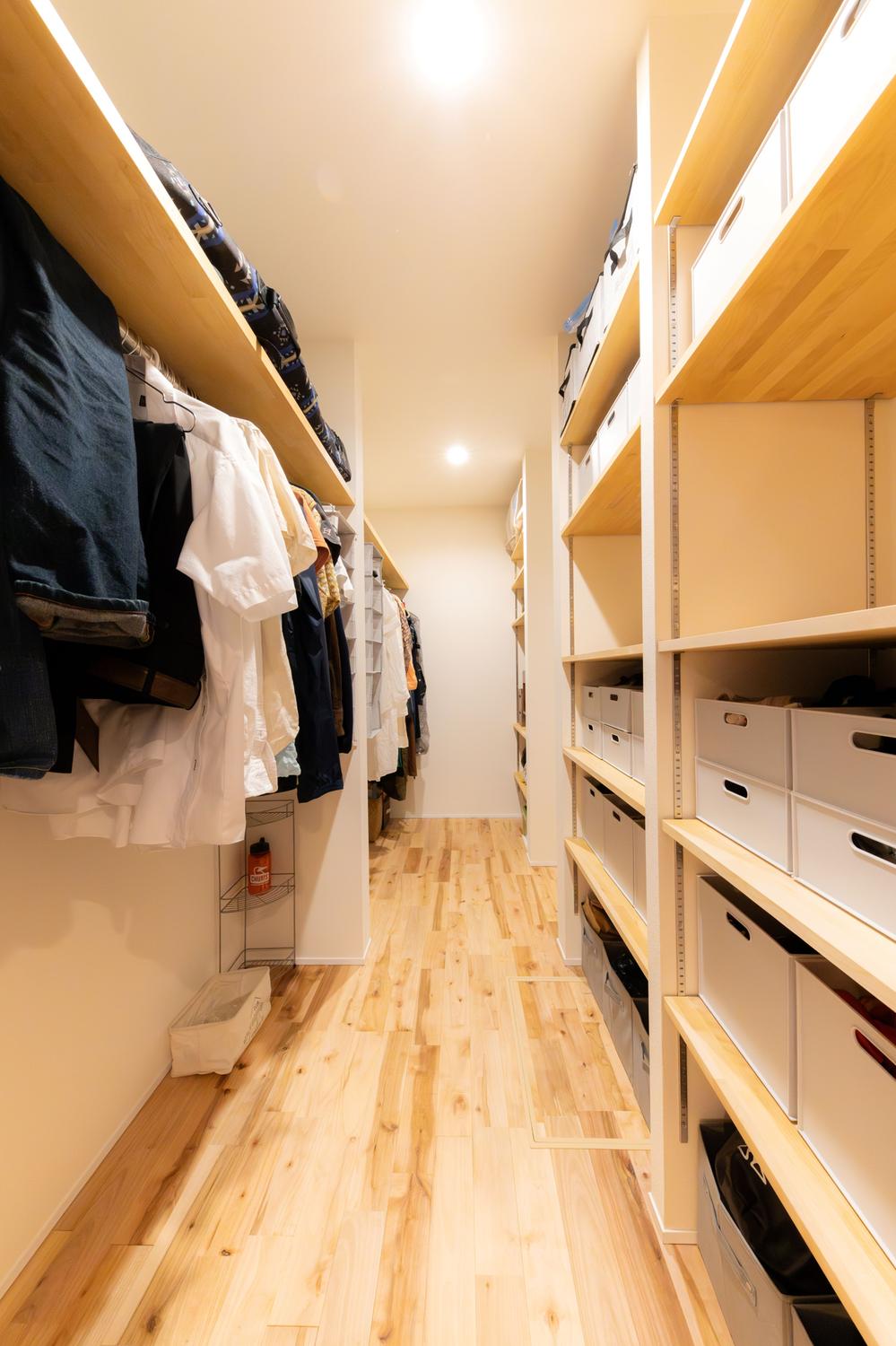 【弊社施工例】床から天井まで無駄なく使える、壁面収納。 「掛ける」と「畳む」を左右で使い分け、空間を有効活用。 無垢材とホワイトで統一された清潔感あふれる空間が、暮らしのノイズを美しく飲み込みます。