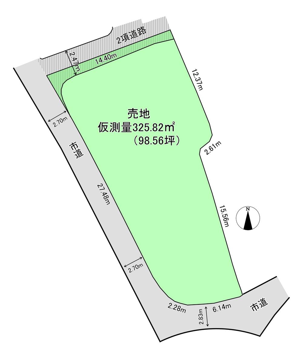 | 建ぺい率・容積率 | 60%・200% | 私道負担・道路 | 15.86㎡、南2.8m幅(接道幅6.1m)、西2.7m幅(接道幅29.7m)、北2.4m幅(接道幅14.3m) | ||
