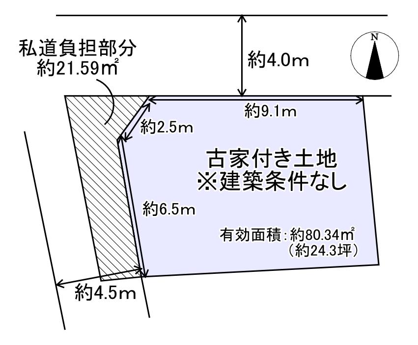 | 建ぺい率・容積率 | 70%・180% | 私道負担・道路 | 21.4㎡、北3.9m幅(接道幅9.1m)、南西4.5m幅(接道幅6.5m) | ||