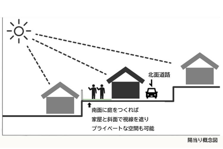 南面はひな壇のように一段下がった地形で太陽の光を多く取り入れることができます。また南側に庭を計画することで隣家や通行人からの視線をカットしたプライベート庭も実現できます。