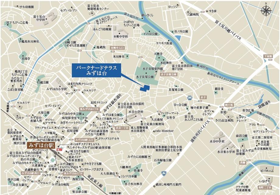 現地案内図都心へのアクセスも快適な、東武東上線「みすほ台駅」まで徒歩17分。周辺には買い物施設も充実し、複数の公園も近隣に点在。